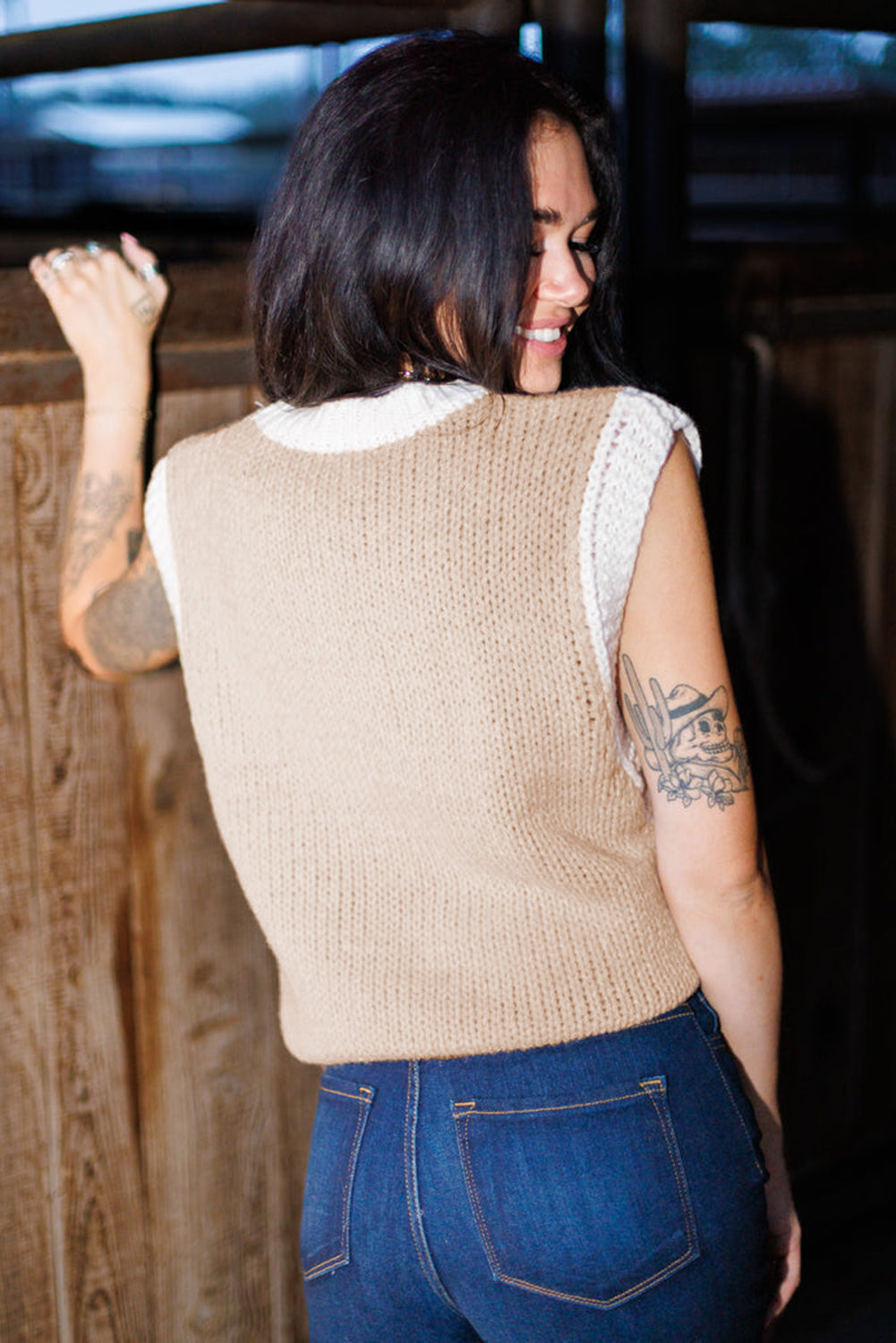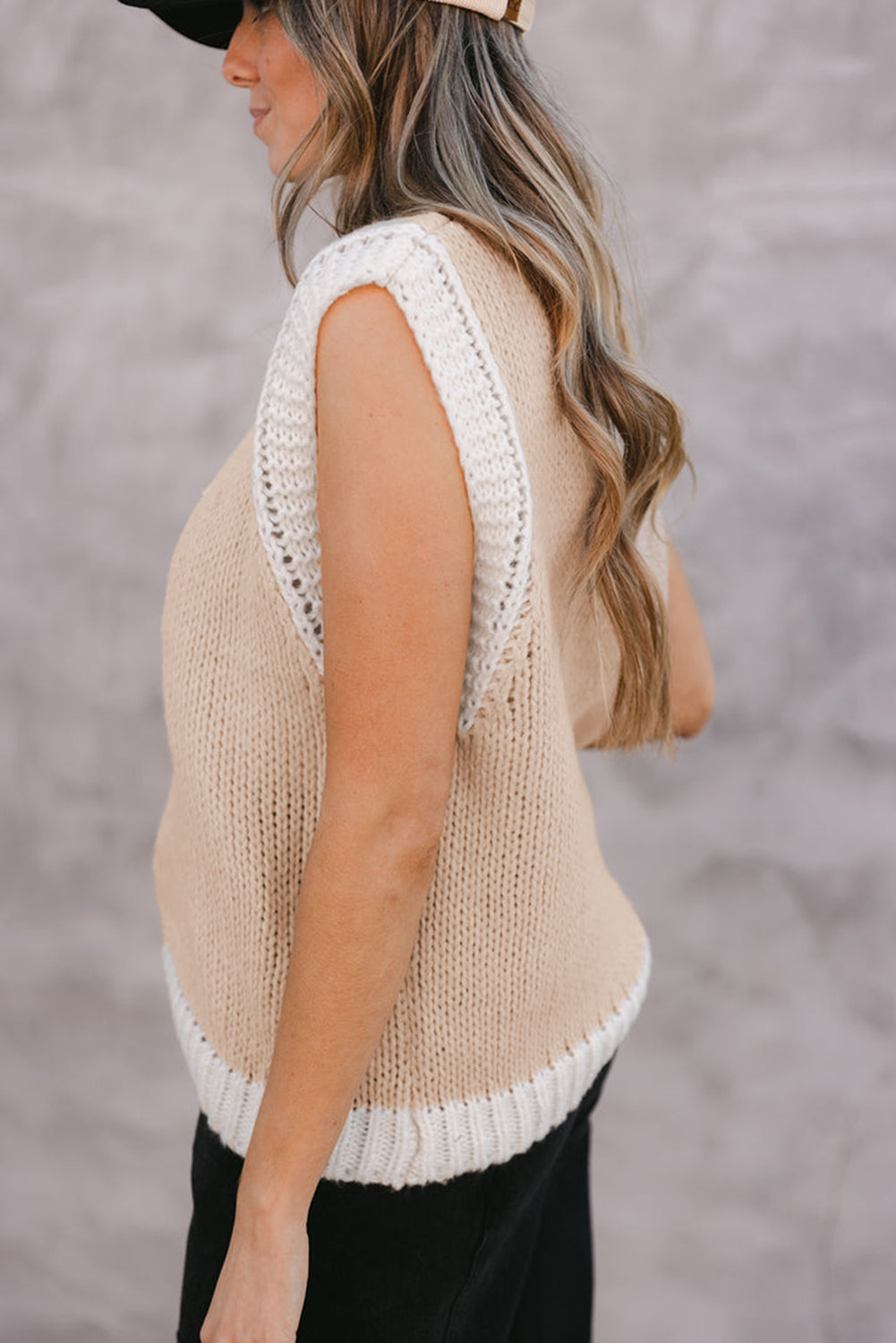 Oatmeal Woven Horseshoe Color Contrast Trim Sweater Vest