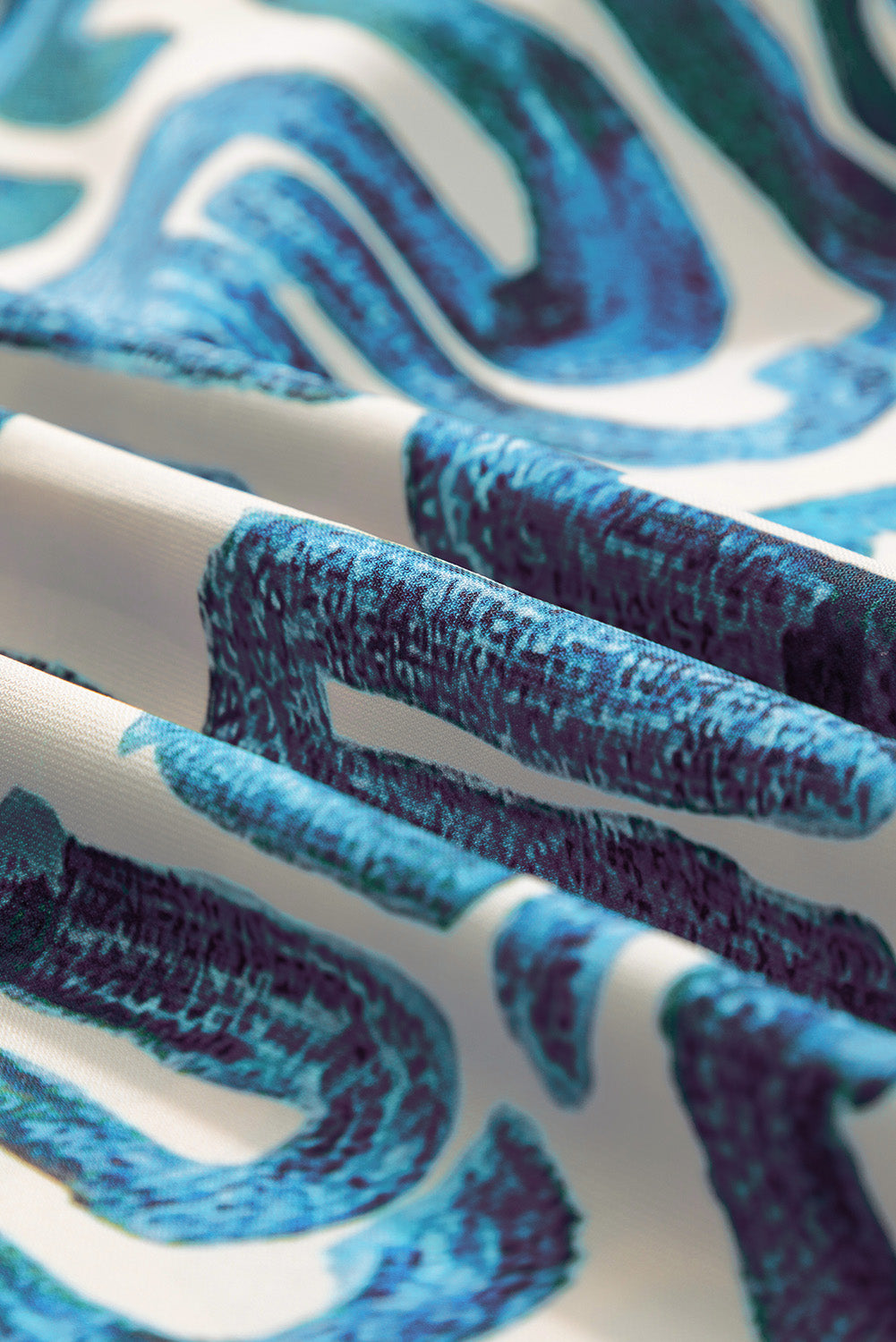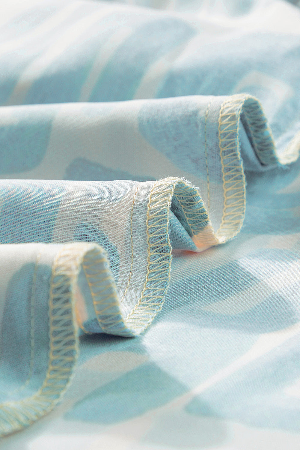 Sky Blue Stripe Plus Size Abstract Print Floral Embroidered Puff Sleeve Blouse